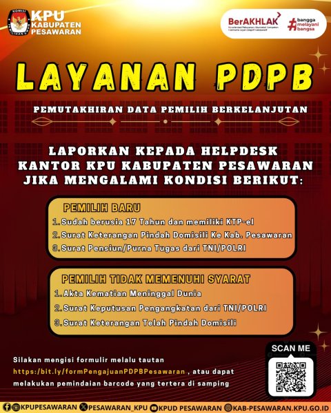 KPU Kabupaten Pesawaran membuka layanan PDPB melalui Helpdesk sebagai wadah untuk masyarakat menyampaikan informasi, saran, serta masukan. Masyarakat juga dapat melaporkan apabila terdapat perubahan status bagi yang telah memiliki hak pilih melalui :