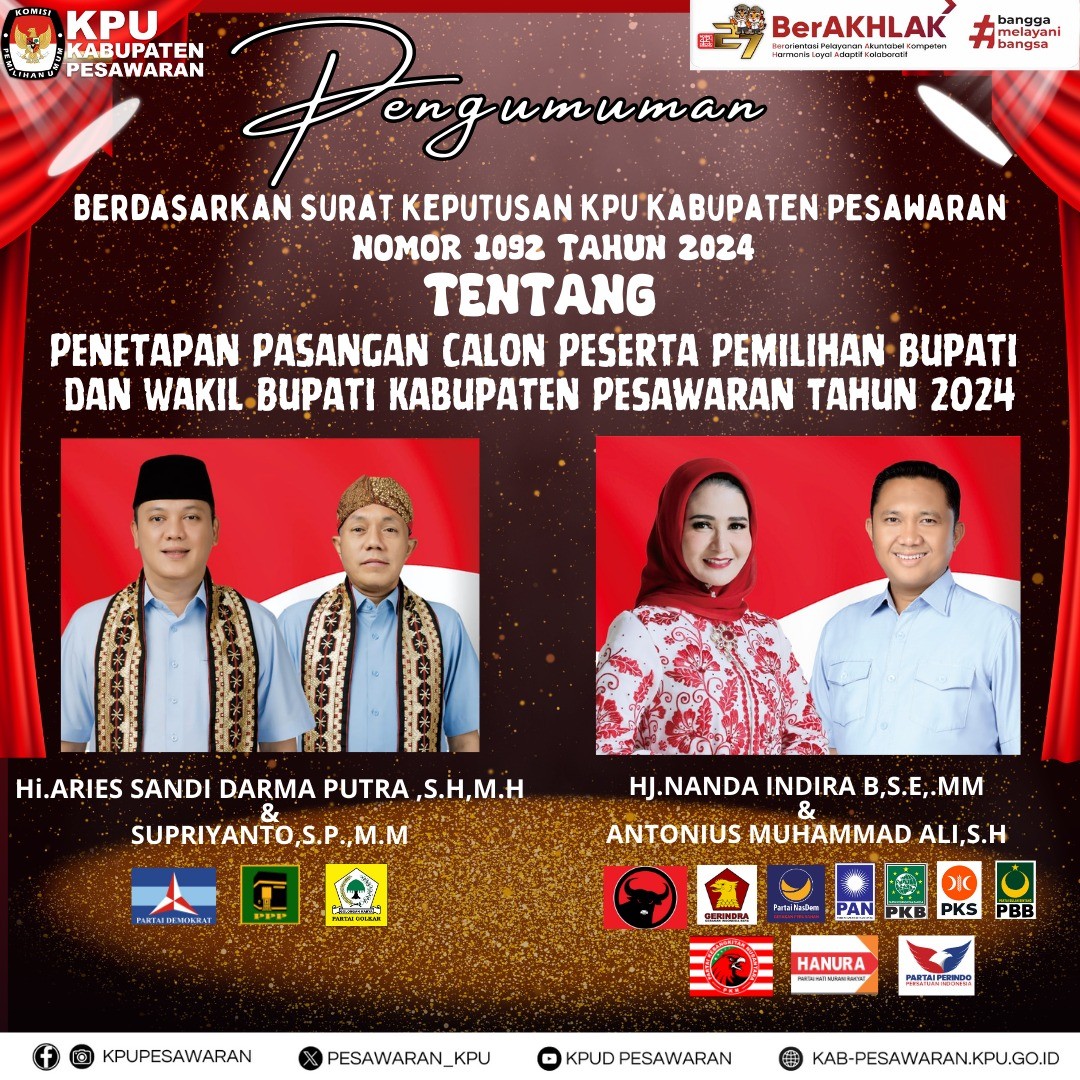 HARI INI MINGGU (22/09/2024) KOMISI PEMILIHAN UMUM KABUPATEN PESAWARAN PENETAPAN PASANGAN CALON PESERTA PEMILIHAN BUPATI DAN WAKIL BUPATI KABUPATEN PESAWARAN TAHUN 2024 SESUAI NOMOR 1092 TAHUN 2024 TANGGAL 22 SEPTEMBER 2024