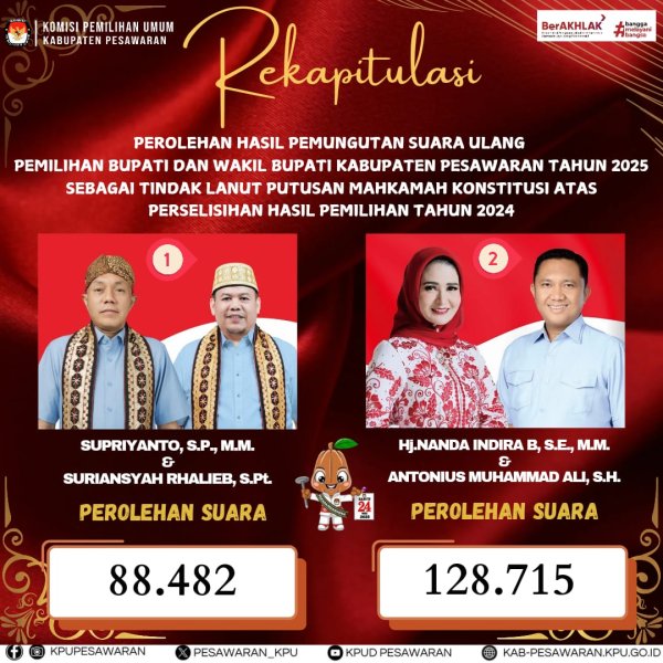 Berikut Perolehan Suara Pasangan Calon No Urut 1 (88.482) dan Pasangan Calon No Urut 2 (128.715)
